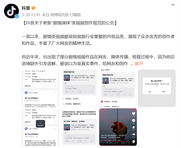 今年三月末,抖音更新了视频创作规范,要求“剧情演绎”类视频必须有明确标注,否则将遭到禁言30天至无期封禁等处罚。