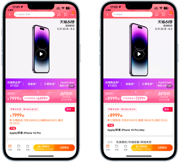 直播间购物链接的前两个分别是iPhone14 Pro和iPhone14 Pro Max,这两款的128G版本在天猫苹果官旗标出来的券后价分别是6499元和7299元。