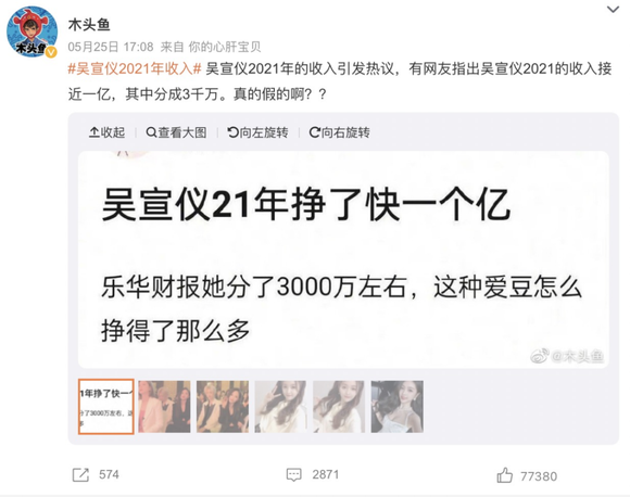 比如,上市成功的乐华交出第一份财报,披露旗下艺人吴宣仪在2021年收入近亿元。消息一出,立刻引发吃瓜群众热议,甚至压过了对乐华“摇钱树”王一博的关注。