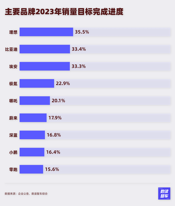 对于2023年销量目标的完成情况,目标设置更高的车企,完成进度反而越理想。目标销量300万的比亚迪,目前已完成三分之一。目标50万辆的埃安,也完成了33.3%;目标30万辆的理想则完成了35.5%。