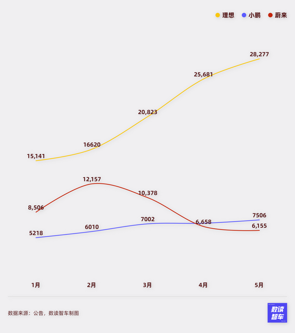 新势力中的理想也达到了历史新高的28277辆,连续第二个月创销量新高。距离月销3万辆的新台阶已经一步之遥。