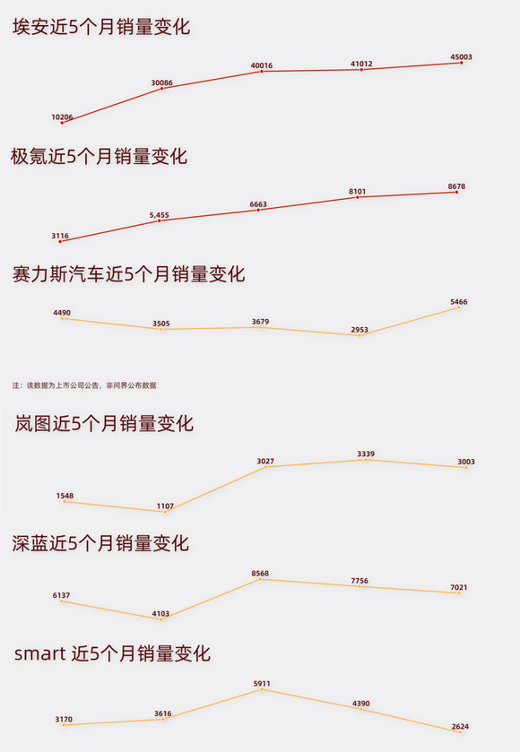 目前公布销量的品牌中,埃安与极氪非常强势。今年以来,这两个品牌销量连续4个月都保持上涨。