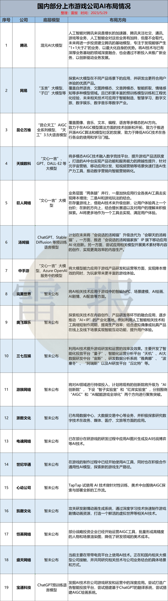 雷报对国内部分上市游戏公司AI布局情况进行了整理。