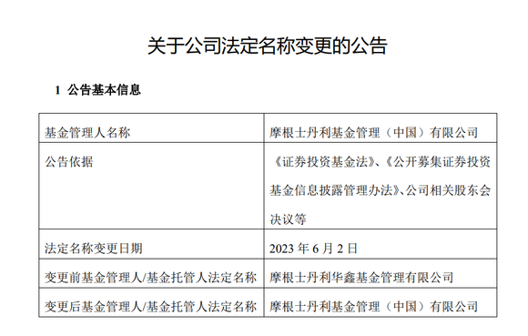 6月3日,摩根士丹利基金公告称,公司名称由“摩根士丹利华鑫基金管理有限公司”正式变更为“摩根士丹利基金管理(中国)有限公司”(下称“摩根士丹利基金”)。