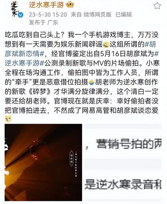 《逆水寒手游》称,爆料中所谓的“胡彦斌新女友”,实际上是现场工作人员,当天胡彦斌为《逆水寒手游》录制新歌MV,因在片场被偷拍才造成这场乌龙。值得玩味的是,在这条辟谣微博中,《逆水寒手游》还带上了#逆水寒手游#的话题,并在评论区为6月30日公测预热造势。