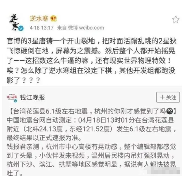 除了撕友商以外,《逆水寒》官微还很乐于蹭各种社会话题的热度。台湾省突发6.1级地震,全国各界都在关注灾后重建情况之际,《逆水寒》官微发文玩梗,戏称“这招数这么牛逼吗,还有现实物理特效”;还有网友,在某法师微博评论区,发现《逆水寒》官微询问“被人侵权,侵权人还来骂我怎么办”。