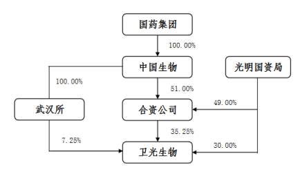 第二步,光明国资局将卫光生物35.25%的股份无偿转让给合资公司。转让完成后,卫光生物控股股东由光明国资局变为合资公司,中国生物将成为公司的间接控股股东,实际控制人变更为中国医药集团有限公司(下称国药集团)。