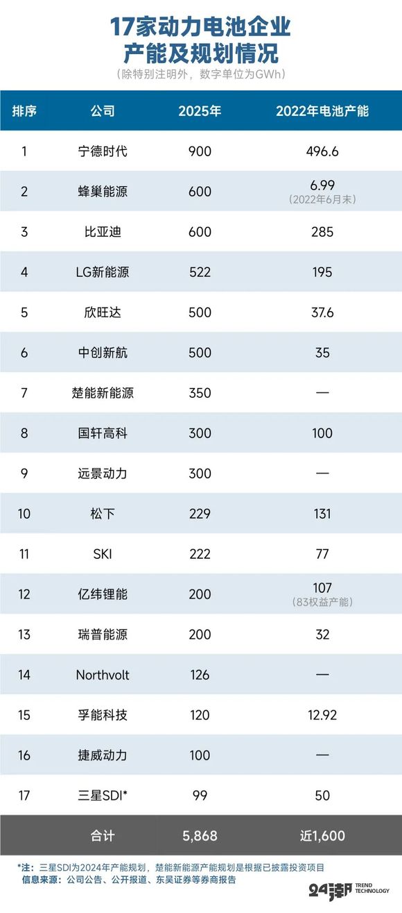 此前24潮团队综合各券商、企业公告等数据发现,仅统计已公开产能规划的全球17家动力电池企业,其在2022年底的产能总计就将近1600GWh,而到2025年的总产能规划更是高达5868GWh!这近乎是2022年全球动力电池总需求量的11.33倍!