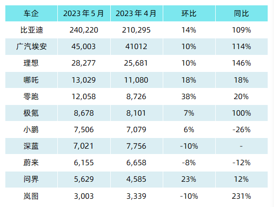 此外,比亚迪月销量超过24万辆,创下了月度历史新高。广汽埃安一路高歌猛进,5月销量4.5万辆,同比增长114%,已连续三个月破4万辆。