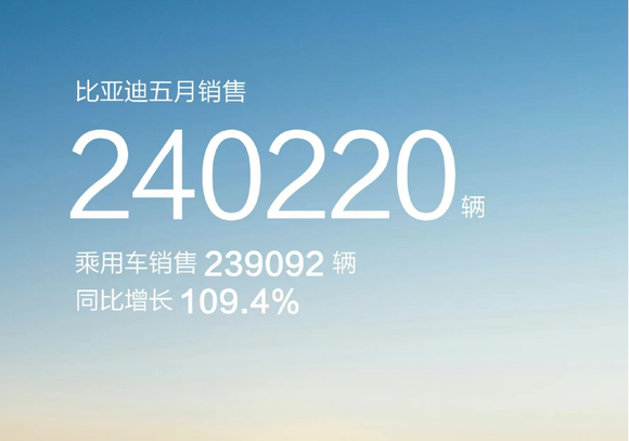 在传统车企方面,比亚迪销量继续强势领跑,一路“狂飙”。比亚迪5月新能源汽车销量240220 辆,同比增长97.63%,环比增长14.2%。打破了此前比亚迪在2022年12月份销售23.52万辆的纪录,也创下了月度历史新高。今年 5 月,比亚迪新能源汽车产量达到了246,259辆,同比增长99.34%。本年累计销售新能源汽车100.26万辆,同比增长97.63%。