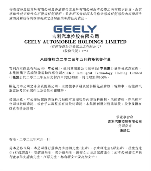 极氪汽车在5月交付8678台,同比增加约 100%,环比增长 7.1%,连续 4 个月同比、环比双增长,成为中国豪华纯电品牌销量冠军,整体累计交付近11万台,创豪华品牌交付速度新高,而且麒麟版电池车型交付提速。据了解,极氪009是麒麟电池首发车型,在5月16日搭载宁德时代CTP3.0麒麟电池的极氪001千里续航WE版正式开始交付。极氪方面表示,极氪X将于本月正式开启交付。