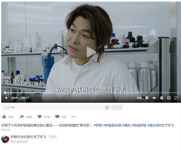近日,“护肤品行业纪录片为了玲飞”(下称:为了玲飞)账号发布了一条名为《评测了15年护肤品的博主的心里话——功效护肤里的“罪与恶”》的视频,以一位博主的视角,聚焦行业卷浓度的风气,以及对消费者造成的一些“伤害”。