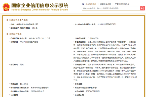而在2022年9月,欧泉琳公司曾因发布辉影首乌防脱育发液、新颜美白祛斑霜、艾迪莎娇点丰韵霜等化妆品广告,通过承诺或虚构使用效果,但无法提供相关证明材料等,被南昌市市监局认定为内容欺骗、误导消费者,构成发布虚假广告的违法行为,并被处以罚款1.035万元。