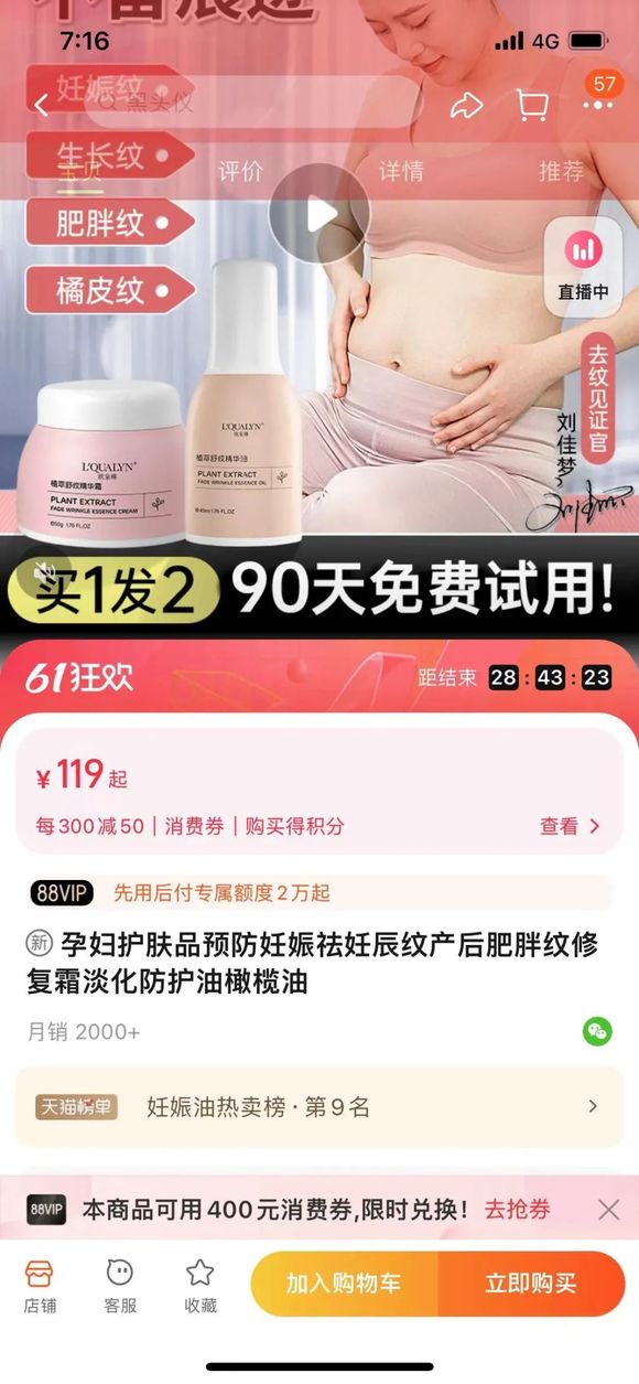 就此,青眼查询国家药监局官网发现,欧泉琳旗舰店中一款月销2000+件、入选妊娠油热卖榜第9名、宣称“孕妇护肤品”的精华油,其产品备案号为“赣G妆网备字2021000385”,备案名为“L'QUALYN植萃舒纹精华霜”,为国产普通化妆品。
