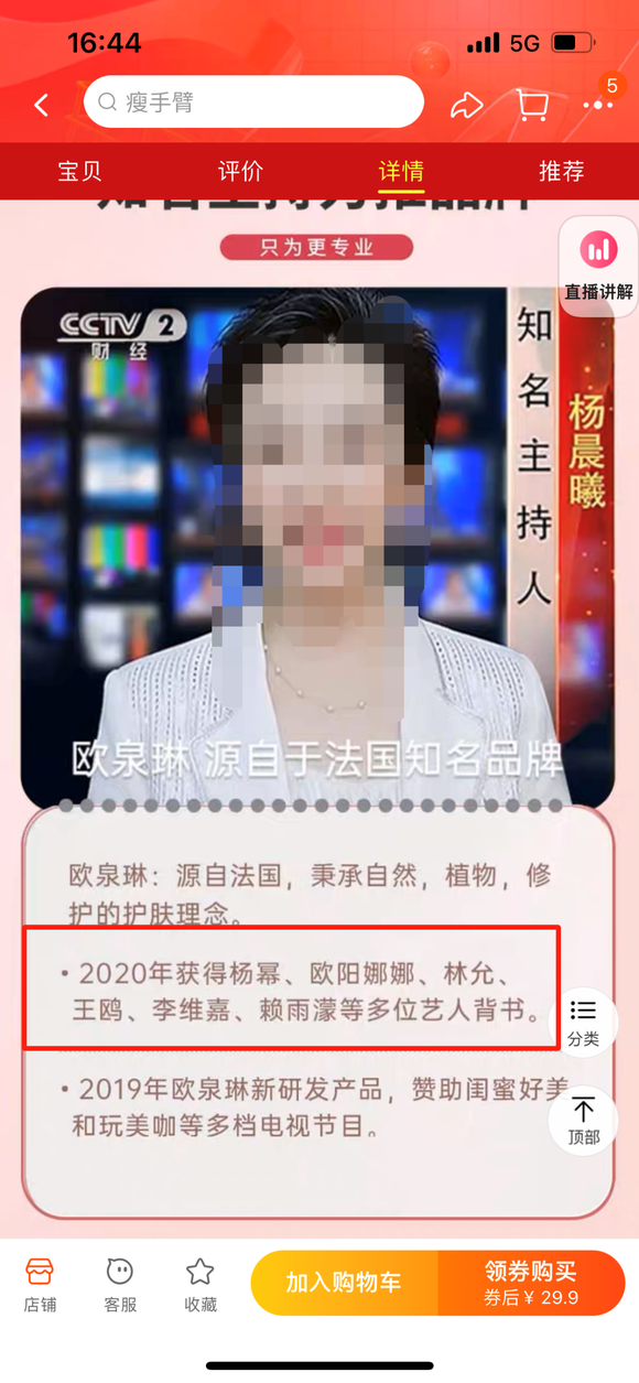 从上图不难看出,欧泉琳店铺中涉及李佳琦、小杨哥等肖像照的图片,后期合成的痕迹较为明显。但当青眼依次点进上述商品页面后,李佳琦、小杨哥等人的照片却并未出现在商品详情页面。
