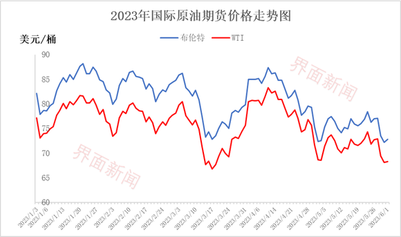 6月1日,WTI的7月原油再次跌破70美元关口,至68.09美元/桶;布伦特7月原油期货跌1.20%,报72.66美元/桶。