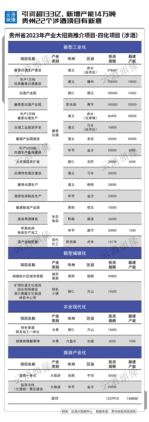 云酒大数据中心梳理统计,其中直接涉酒的项目共22个,引资规模达133.79亿元。
