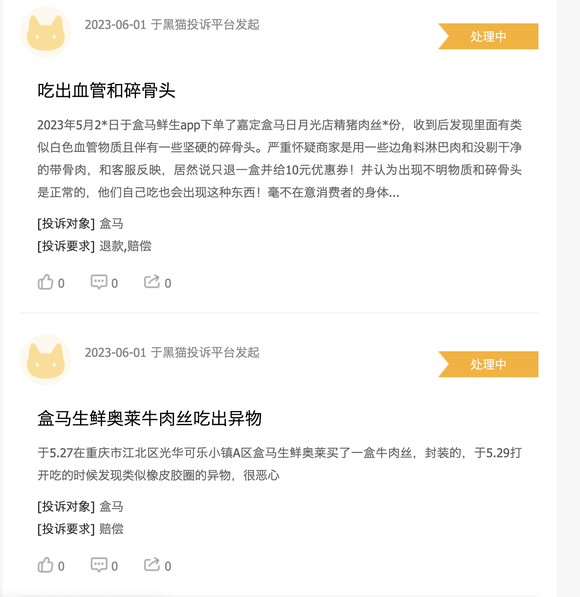 事实上不止盒马奥莱店,其他业态的品控也不够稳定。在黑猫投诉上关于盒马的投诉贴中多则帖子指出了盒马鲜生食品中吃出异物、变质等食品安全问题。