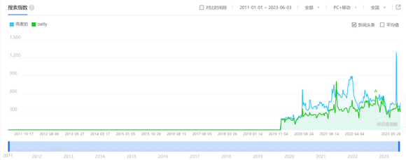 除了价格,我们再来看热度,从下图可见,在中国本土市场,燕麦奶的短期热度和长期热度均不具有优势。