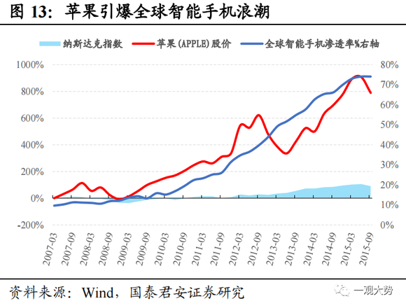 相关数据显示,自2007年首款iPhone发布以来,全球智能手机渗透率大幅提升,从2007年的9.6%,大幅提升至2015年的74%,期间苹果公司股价大涨近八倍,涨幅远超同期纳斯达克指数。我国智能手机市场则在苹果的引领下蓬勃发展,智能手机渗透率从2011年的15.8%迅速提升至2015年底的90%。