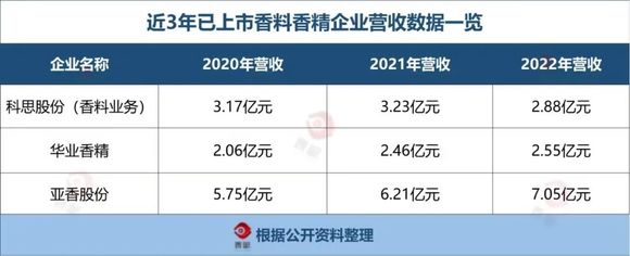 据青眼梳理近3年上市香料香精企业财务数据,这些公司业绩基本保持稳定增长。譬如,华业香料、亚香股份,3年间营收分别增加0.49亿元、1.30亿元,科思股份香料业务则有所下滑,3年缩水2900万元。不过,科思股份化妆品活性成分及其原料业务则有所增长,2022年,其总营收已达到17.65亿元。
