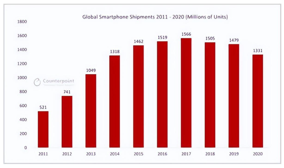 全球智能手机的巅峰大约在2017年前后,从那以后,整个市场就一直在走下坡路。