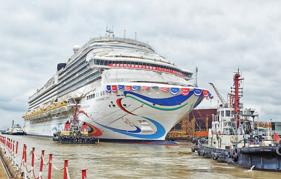 6月6日,首艘国产大型邮轮“爱达·魔都号”在上海外高桥造船厂完成坞内系列试验后顺利出坞,现转入码头建造阶段。该艘邮轮全长达323.6米,总吨位高达13.55万吨,可搭载乘客5246人,于2019年开工点火开始建造,计划于2023年年底交付。