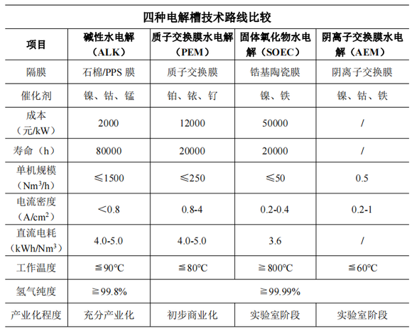 电解槽也分不同技术路线,有碱性水电解(ALK)、质子交换膜水电解(PEM)、固体氧化物水电解(SOEC)和阴离子交换膜水电解(AEM)四种路线,碱性应用比例最高,大概能占到已有项目接近80%的比例,处于规模产业化发展阶段,PEM处于初步商业化阶段,占已有项目20%左右,SOEC和AEM还处于实验室研发阶段,暂时还没商业化落地。