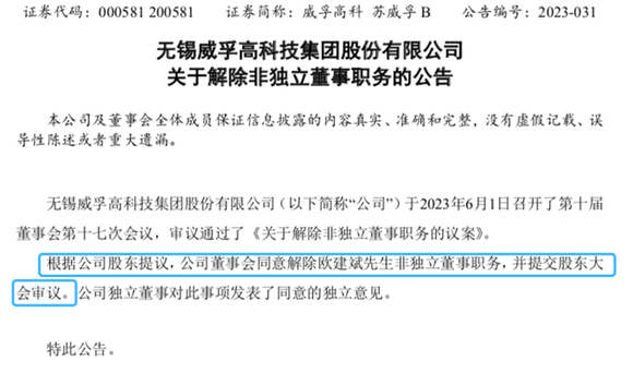 6月1日,在公司常务副总经理、财务负责人欧建斌被停职不到一周后,威孚高科进一步宣布将解除欧建斌非独立董事职务,并将在6月19日召开股东大会审议。同期,冯志明则被选为新董事和副总经理。