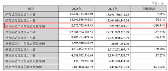 值得注意的是,因平台贸易现金流出,威孚高科2022年经营活动产生的现金流量净额为-25.76亿元,同比下滑510.34%。