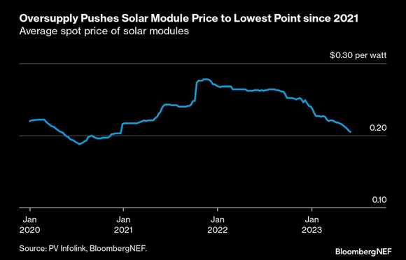 据彭博新能源财经数据,5月光伏产业价值链中材料和组件的价格下跌加剧,推动标准单晶组件的价格在月底跌至每瓦0.205美元(约1.46元人民币),这是2021年初以来价格的最低点。