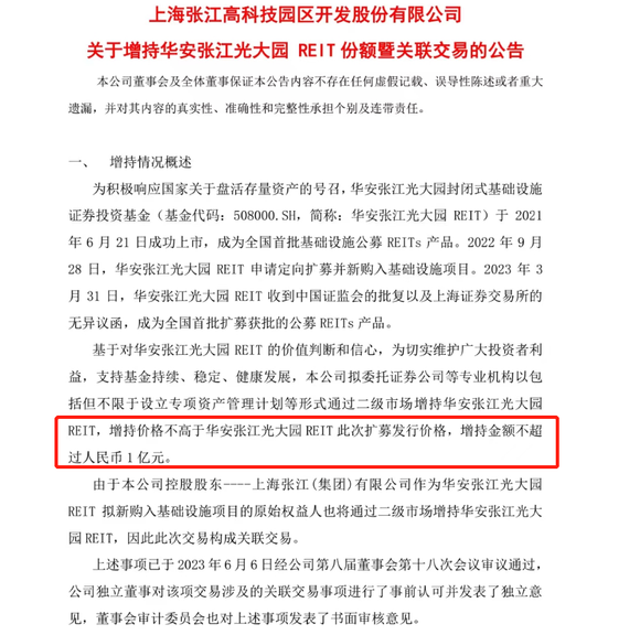 先来看因为重要租户退租而备受关注的华安张江光大园REIT,6日晚间,张江高科(600895.SH)发布关于增持华安张江光大园 REIT份额暨关联交易的公告。