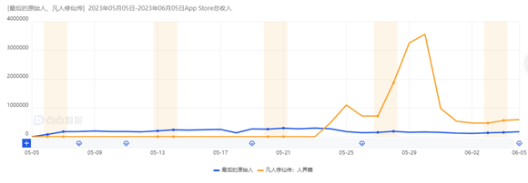三七今年两款MMO《最后的原始人》《凡人修仙传:人界篇》iOS预估收入总体差距较大,截至6月5号,《最后的原始人》收入约为4247万元,《凡人修仙传:人界篇》累计预估收入超过1亿,后者出现上线期收入峰值。