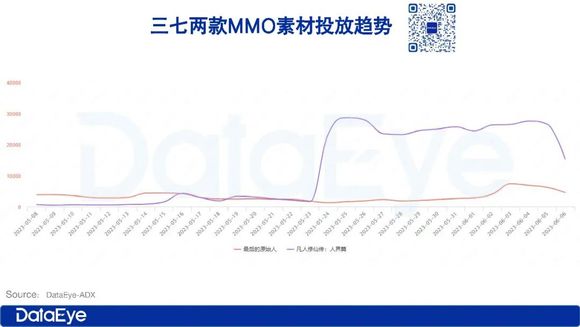对比两款三七的MMO,《凡人修仙传》投放量更为突出,上线当天投放超过2.3万组,而后持续加大,上线五天日均投放量接近2.5万组。