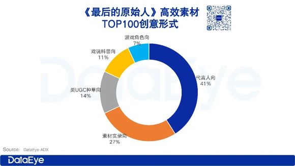 《最后的原始人》素材主要是以下几个方向:代言人向、实录向、UGC种草向、戏说科普向、游戏角色向。高效素材中,代言人向、实录向占比更高。