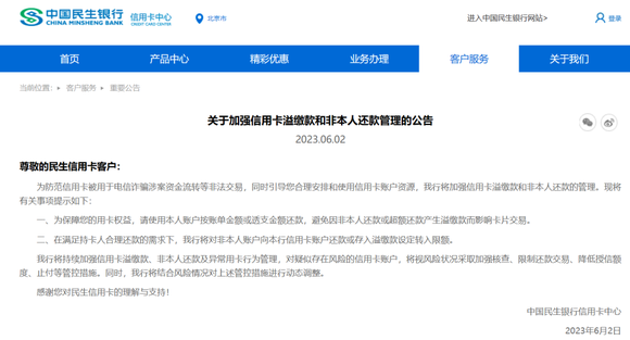民生银行将持续加强信用卡溢缴款、非本人还款及异常用卡行为管理,对疑似存在风险的信用卡账户,将视风险状况采取加强核查、限制还款交易、降低授信额度、止付等管控措施。