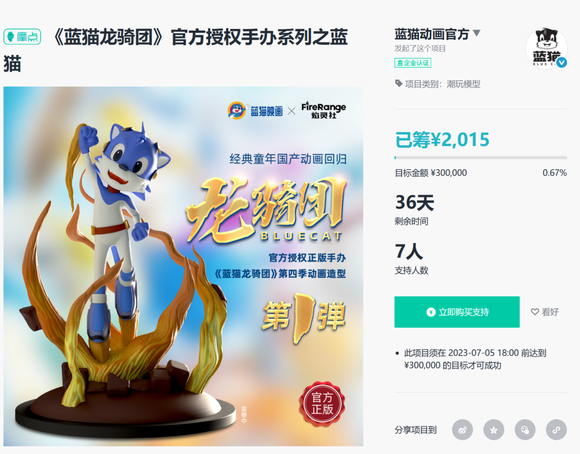 然而官方越努力,显得越心酸。虽然众筹手办在B站、微博都进行了宣传,但销量惨淡,支持人数仅7人,初定的30万元目标金额,只完成了0.67%。除了质量、价格因素外,五月初蓝猫粉丝群里关于“禁二创”的聊天记录截图被挂至空间、微博,官方就此事回复粉丝时的用语与态度,则是粉丝不想支持童年情怀的另一个原因。