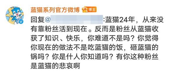 众所周知,大部分同人创作的出发点是“为爱发电”,因此蓝猫官方的态度引发了一场脱粉风波。还有年轻网友前去评论区与官方对峙,官方却回复诸如“蓝猫24年,从来没有靠粉丝活到现在”等言论,更加点燃了粉丝怒气。