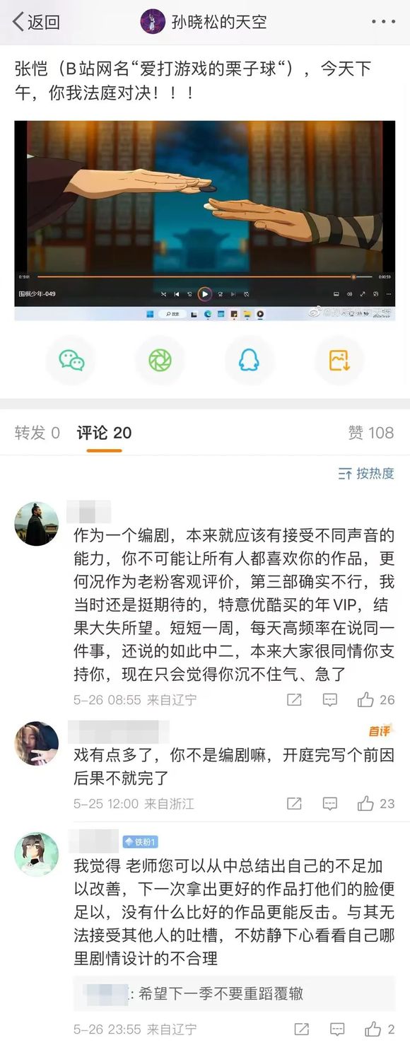 《新围棋少年》编剧孙晓松在开播前中期,社交平台与粉丝互动密切,拉高了不少忠实粉丝的期待值。而从实际表现来看,新作试图将格局提升至家国情怀,内容细节却饱受诟病,被观众指出“角色崩坏、剧情拖沓、衔接生硬”,B站2.7万观众为其打出5.4分。作品播完后,编剧甚至以“网络暴力,身心健康严重受损”为由,将吐槽自己的UP主告上法庭,引得观众留言“不如看看自己的作品剧情哪里不合理”“建议用新作证明自己”。