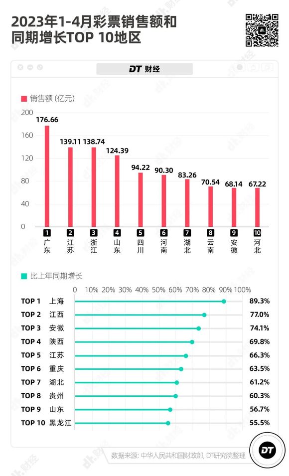 彩票销售比上年同期增长最多的是上海,主要是去年受疫情影响,彩票业的暴涨相当一部分是基于暴跌后的恢复。此外,江西、安徽、陕西、江苏、重庆、湖北、贵州这些省的增长也都超过了60%。