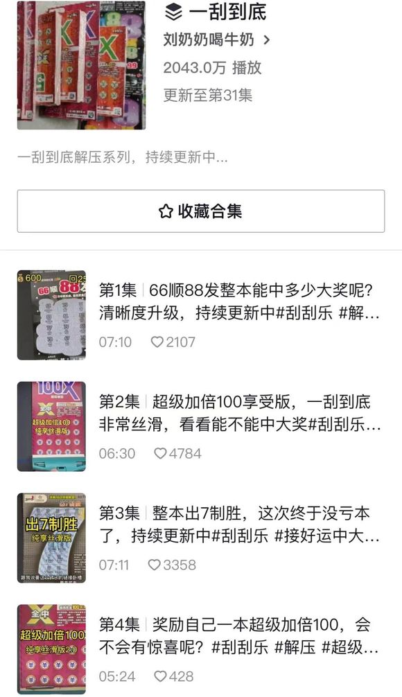 如果你关注彩票并经常刷短视频,就会发现抖音上已经出现了一批专门的“彩票博主”,他们会去各种新开的或人气旺的彩票店探店,直播买彩票、刮彩票的全过程,这些博主喜欢“批量式买彩票”,比如@刘奶奶买牛奶就有一个“一刮到底”系列:整本整本买刮刮乐,然后一个个慢慢刮,虽然有时候“本600,回50”,但主打一个“解压、过瘾、爽”。