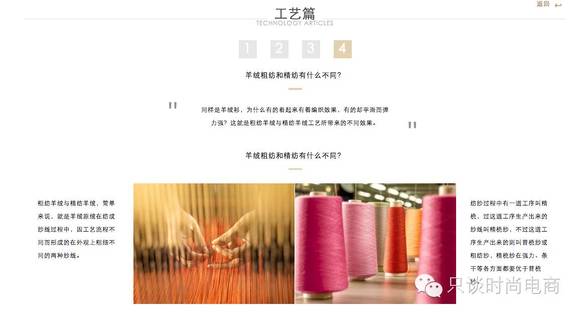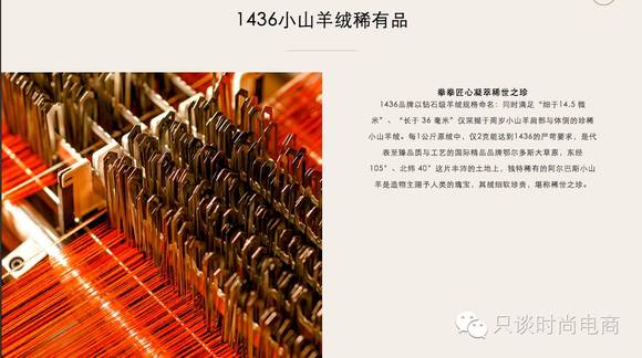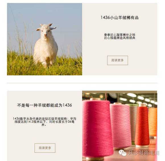 1436用‘品牌故事’和‘羊绒专家’ 两个板块介绍。下图是品牌故事页面,介绍1436独有的小山羊绒。