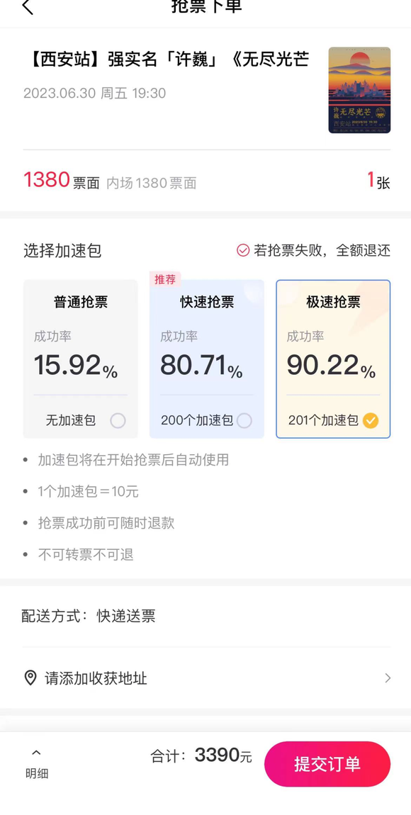 点进去看,刘鑫恍惚间来到了春运抢火车票现场。App上需要购买加速宝抢票,有无加速、200个加速包、201个加速包等三种抢票方案,据刘鑫观察不同的场次所需加速包不同。而原价1380元的内场票面,在购买201个加速包后需要以3390元的价格拍下,抢票成功率为90.22%。