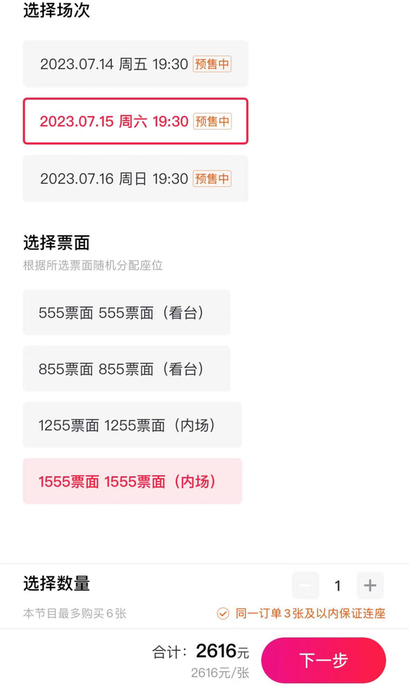 娱乐独角兽观察到,该票务平台目前在售多场热门演唱会票务,包括杭州、武汉、深圳及沈阳场的五月天《好好好想见到你》演唱会门票。与刘鑫购买的许巍演唱会不同,五月天沈阳站的预定界面直接显示了动态票价。截至发稿前,7月15日场次价值1555元的内场票面售价2616元。