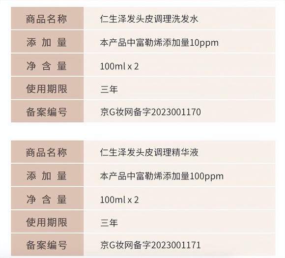 在仁生泽发的网店上,他们销售的产品有两种,一种是仁生泽发头皮调理洗发水,另外一种是仁生泽发头皮调理精华液,两款产品均是京G妆网备字编号,也就是说他们销售的其实是化妆品,而且是普通化妆品,不具备特殊功能。而头皮调理洗发水的备案信息显示这款产品的功效是清洁和保湿,而头皮调理精华液的功效只有保湿。