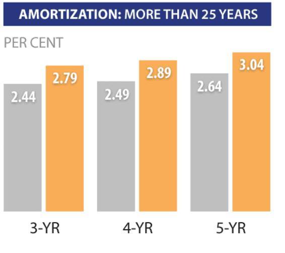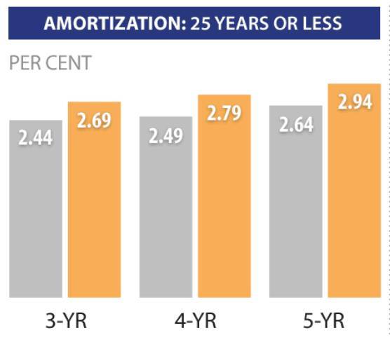 RBC贷款时间25年及以下5年固定贷款利率从2.64%增长到2.94%,贷款者每月还贷金额则从$1,310上涨到$1,354,也就是说每月需要多付44加元;