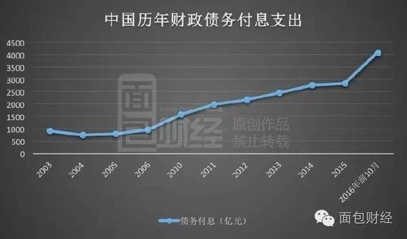 下图是面包财经根据财政部数据绘制的中国历年财政收支中所包含的债务付息支出变动图: