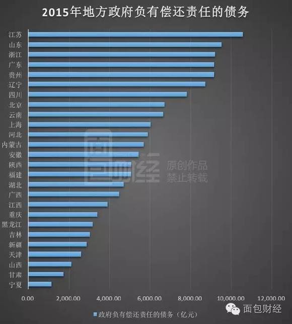 翻查各省审计厅披露的数据:过去几年政府债务普遍大幅增加,一些经济大省同时也是负债大省。截至2015年底,江苏省地方政府负有偿还责任的债务高达10556亿,高居榜首,成为首个破万亿的省份。山东、浙江和广东三省紧随其后。下图是面包财经根据统计数据绘制的各省地方政府债务排行: