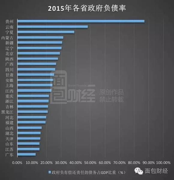 按照这个官方认可的计算方法,贵州的负债率早在两年前就已经超过“红线”。2013年6月底,贵州的负债率为67.45%,而到2015年底已上升到86.98%,高居各省之首。此外,云南、宁夏、辽宁等地的负债率也位居前列。下图是面包财经根据统计数据计算后,绘制的各省地方政府负债率: