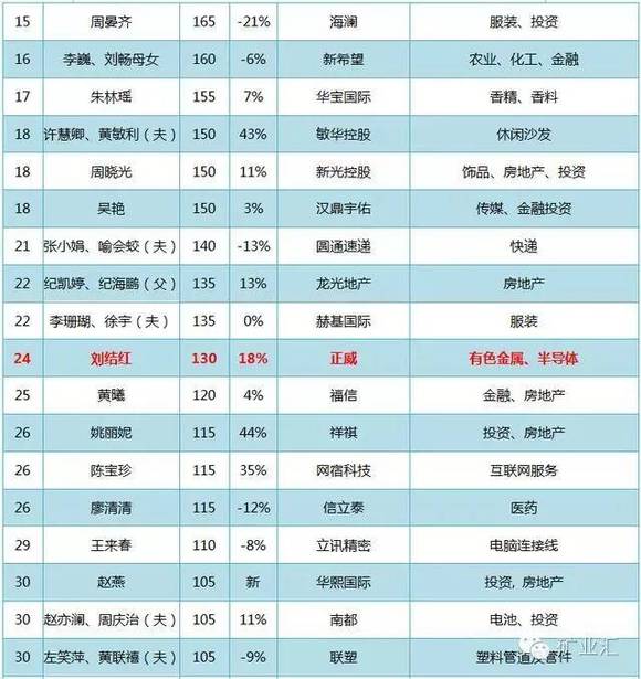 最振奋人心的是,正威国际集团(以有色金属完整产业链为主导的全球化集团公司)的“矿业老板娘”——刘结红以130亿元的财富值位列24名!
